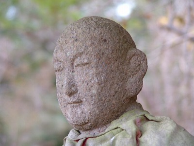 | 佐吉自身も寄進者になっている祠、蜂の巣状になったお堂は上部からくり貫かれ中に「五寸三分の狂気」と賞された延命 地蔵が収められている。 何故狂気なのか、小さな石に全長十六センチの細かい細工をしてあるからだろうが、元は五十センチ程の細長い石の先に仏 像を彫り十六センチでカットしたもの、石の粒子を削り取るような細工は根付け師が得意とした仕事、佐吉が放浪の旅の途 中で根付け師と交流があったのでは。 |
