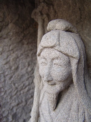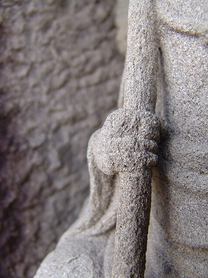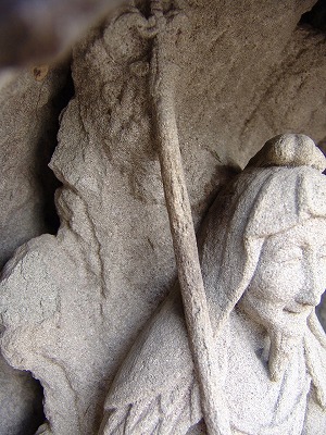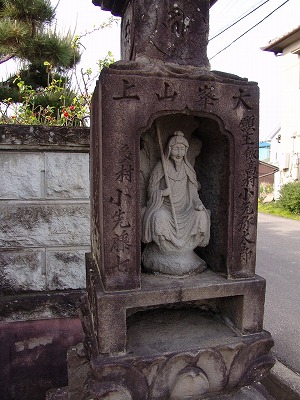 | 飛鳥の道標わ撮影した帰り天理インターへ向かう途中の裏道、何気なく通り過ぎた道端にまさかと思い戻って確認間違いなく佐吉 作の役行者だ塔芯を刳り貫き中に納まっているが、足が収まりきらず風化して欠損。 まだナビも付いてなく住所も不明だったが佐吉マニアは探し当てた流石です、宝篋印塔はもっと古く佐吉が依頼され後から刳り貫 いて役行者像を組み込んだのだろう、近年交通事故で相輪が落下破損作り変えたと佐吉マニアに教えてもらえた。 |