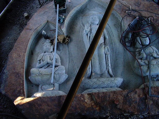 普賢菩薩と釈迦像の間に黒くパイプ穴の痕が、唯一彫りすぎた個所舟形を彫り込み調整して何とかなった