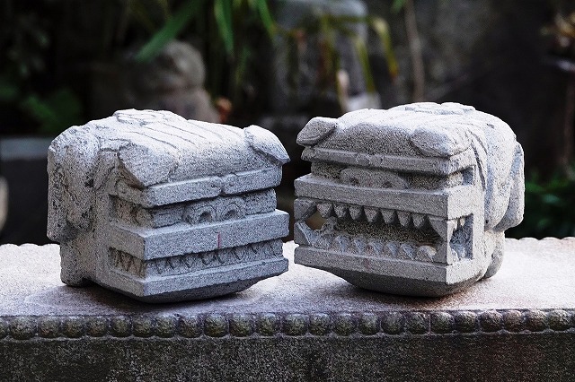 狛犬シーサー 和泉砂岩 完売しました 狛犬職人が遊び心で彫ったシーサー、狛犬で言う獅子と獅子の組み合わせで一対、飼われている証に首輪と鈴を付けてます。 |