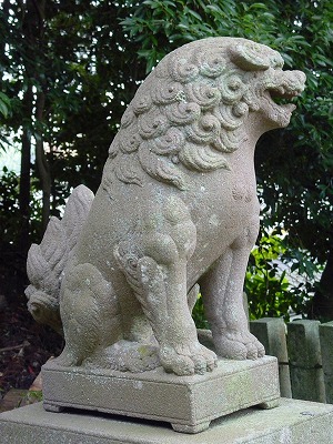 | 嘉永七年、佐吉が彫る浪速型狛犬のアウトラインが決まり始めた、太目の体躯で小顔・耳は横耳で先端はこめかみ迄・蹲踞の構えで前足の力は抜いている・体毛は風に靡くように波打つ。 |