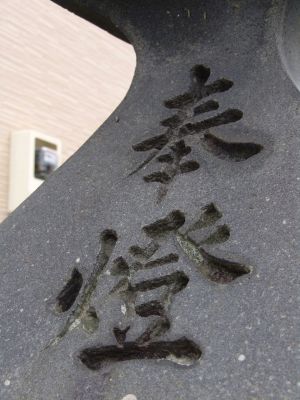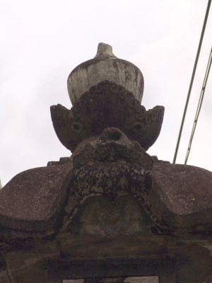 | 初代難波金兵衛が存命中に二代目が彫った神前灯篭。 石は新屋石とよばれる地元の安山岩で、緻密で硬く風化にも強い、初代と佐吉の合作灯篭から十九年後に彫られた、 宮付き神前灯篭。 |