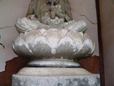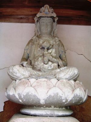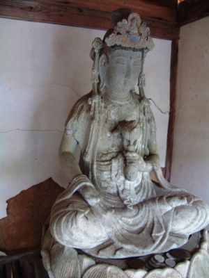 | 丹波佐吉は大師山の仕事を中断して、生まれ故郷の近く青垣町大燈寺で聖観音像を彫った。石は和泉 砂岩、完成した当初からお堂に入っていたため彩色が残っている、風雨に当たって無いので風化も無い 完成時には光背付いていたが現在は欠け落ちている。佐吉の石仏は面長でなで肩、顔の彫りは浅い。 |