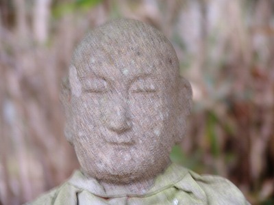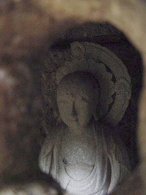 | 佐吉自身も寄進者になっている祠、蜂の巣状になったお堂は上部からくり貫かれ中に「五寸三分の狂気」と賞された延命 地蔵が収められている。 何故狂気なのか、小さな石に全長十六センチの細かい細工をしてあるからだろうが、元は五十センチ程の細長い石の先に仏 像を彫り十六センチでカットしたもの、石の粒子を削り取るような細工は根付け師が得意とした仕事、佐吉が放浪の旅の途 中で根付け師と交流があったのでは。 |