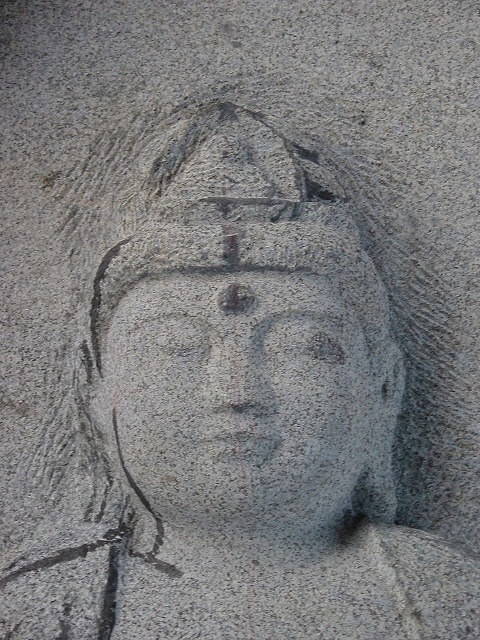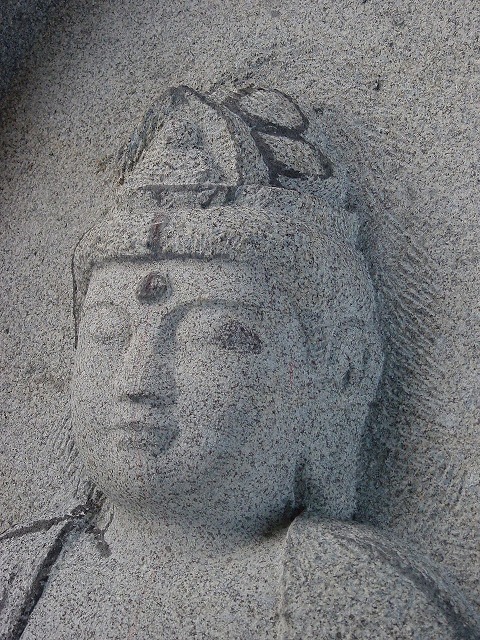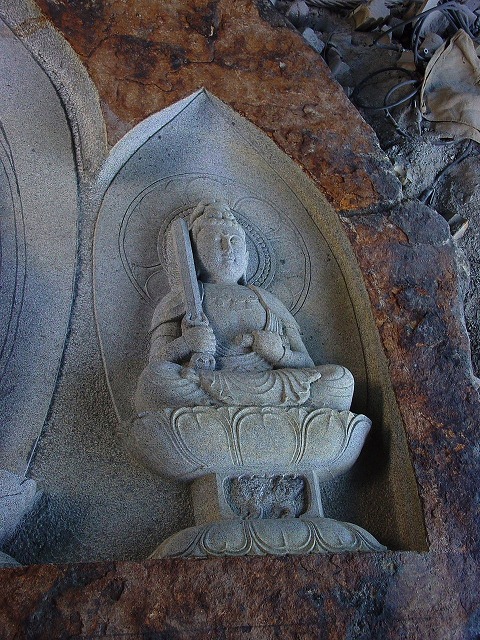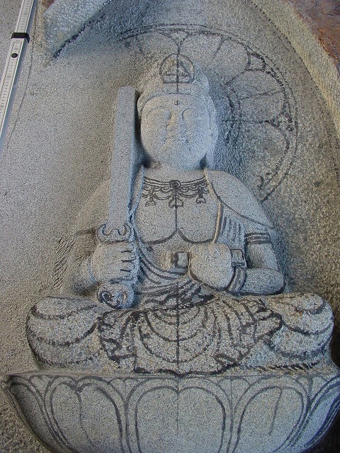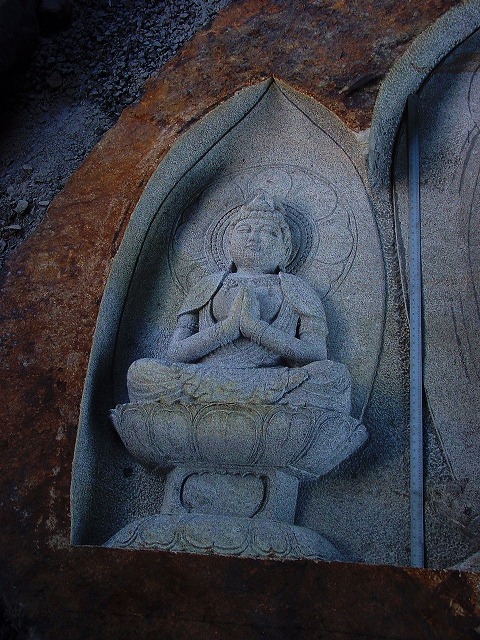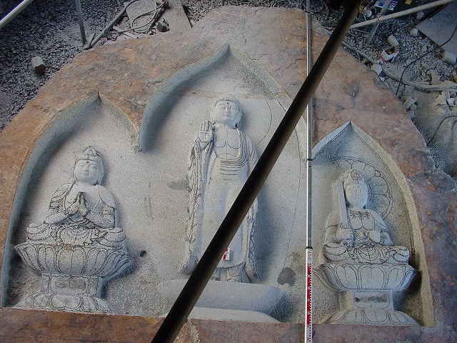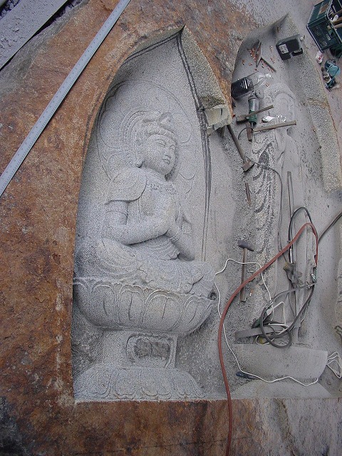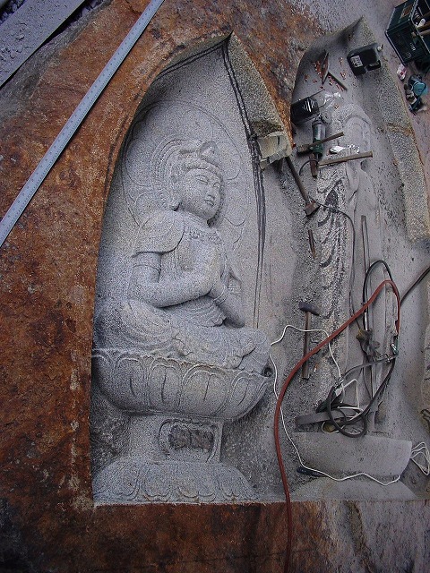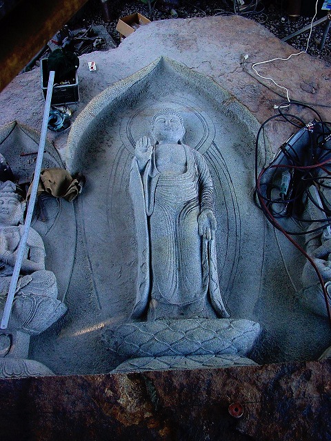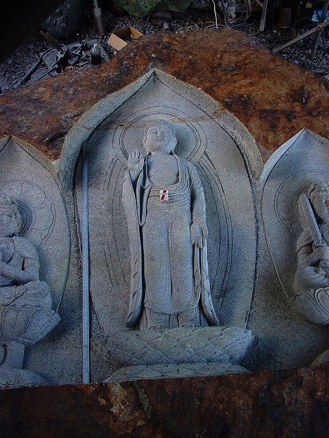 普賢菩薩と釈迦像の間に黒くパイプ穴の痕が、唯一彫りすぎた個所舟形を彫り込み調整して何とかなった