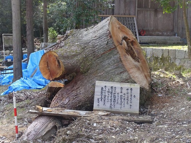 台風の被害で真っ二つに割れてしまった狛犬の修理、一抱え以上の大木が倒れ下敷きになった狛犬が二体