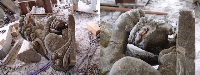 江戸狛犬修理の案件、地元の石材店が神社の参道で作業中誤って狛犬に衝突、幸い土手ののり面に