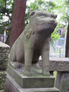| 建て年号不明 神明社 (非公開) もう一対近所の神明社に、少し大きなはじめ狛犬が野外に置かれている。 上のサル顔狛犬と同じ、小顔で寸胴足は貫いてなく、タテガミも不明尻尾は共に三本のスジで表現してある。 |