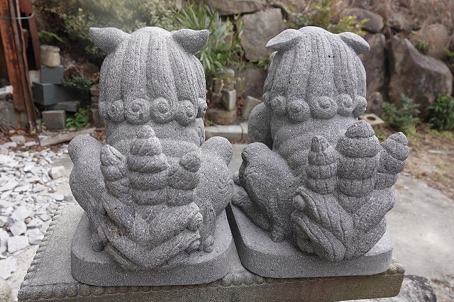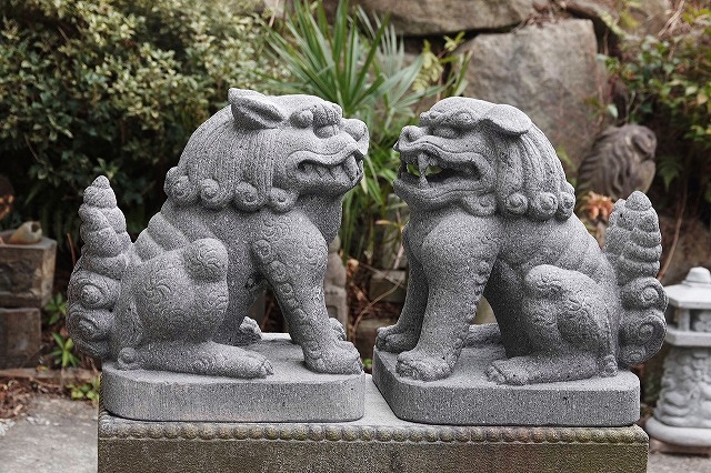 狛犬職人が遊び心で彫った狛犬、産地不明の溶岩を手に入れた所々に火山ガスが抜けた穴があるが大きな穴は補修して仕上げてあります。