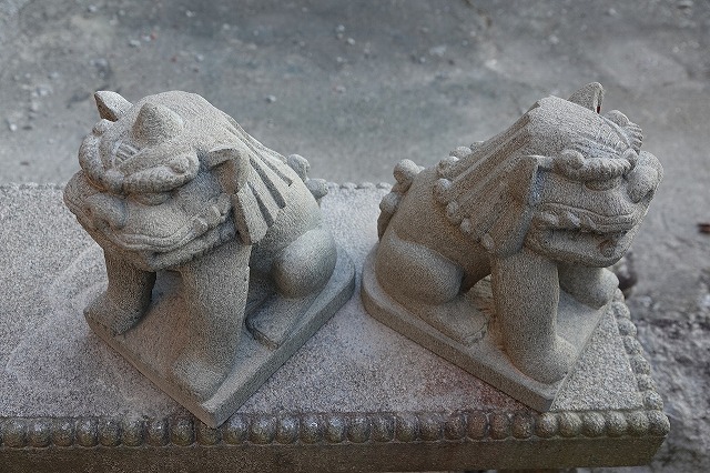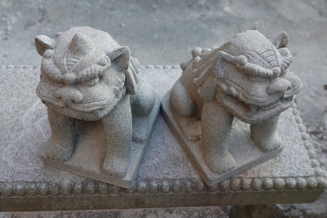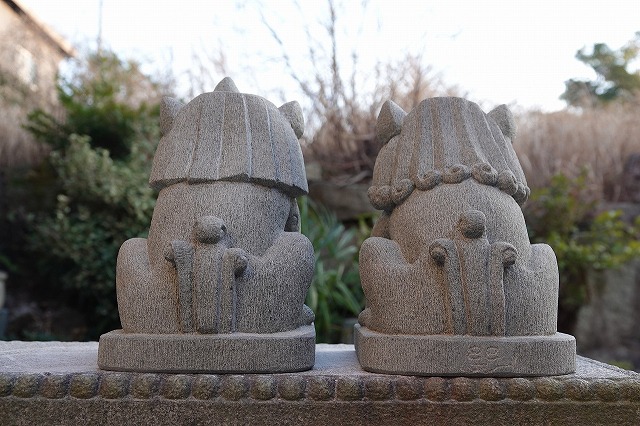 古い越前狛犬を今風にアレンジして彫刻、オリジナルはかなり小型でスリム安定が悪く殆どが欠けている幅広にし、少々の地震に耐えれるように合えて肥満体で存在感をアピール。
